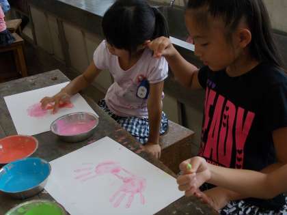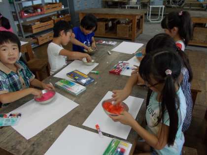 とろとろえのぐを使って絵を描きました。指に取って描くことに驚いていましたが、触ってみると、「気持ちいい!」という声が飛び交いました。作業中は、どの子も思いのままに一生懸命描いていました。