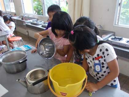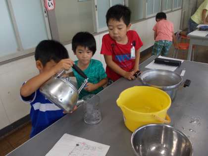 今日は、バケツやボール、やかんに入る水の量を予想してから、実際に1リットルますを使ってかさをはかってみました。