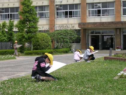 4年生図工の授業風景です。一宮市子ども写生大会に向けて校内の風景写生に熱心に取り組む姿です。見慣れた風景を自分の感じ方・見方を大切にして描いています。