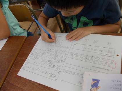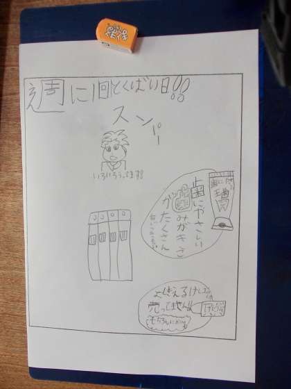 まちで一番のスーパーを作ろう!(10月6日の3年生) 公開日 2016/10/06 更新日 2016/10/06 3年 社会科の「店で働く人」のまとめとして、たくさんのお客さんを呼ぶためのスーパーのチラシ作りをしました。「世界一安い!」「安全でしんせんな野菜!」「広い駐車場があるよ!」など、自分が店長になった気持ちで考えることができました。