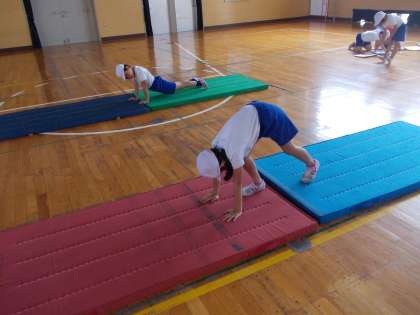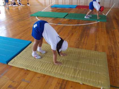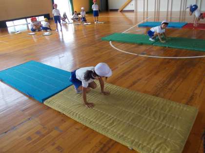 マットあそび 10月6日(木)の2年生 公開日 2016/10/07 更新日 2016/10/07 2年 今日は、マットで、「いぬ」「しゃくとりむし」「かえるの足うち」「まえまわり」の練習をしました。みんな一生懸命体を動かしました。