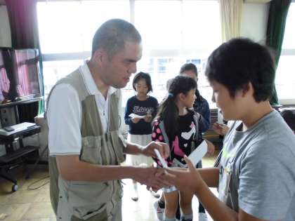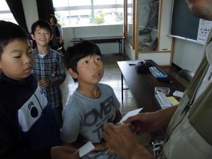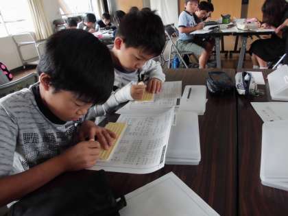 福祉実践教室その2【10月8日(土)の5年生】 公開日 2016/10/08 更新日 2016/10/08 5年 点字の打ち方を習い、実際に打ってみました。自分の名前を打ち、講師の先生に読んでいただきました。自分の名前が正しく読んでもらえてうれしそうでした。貴重な体験ができました。