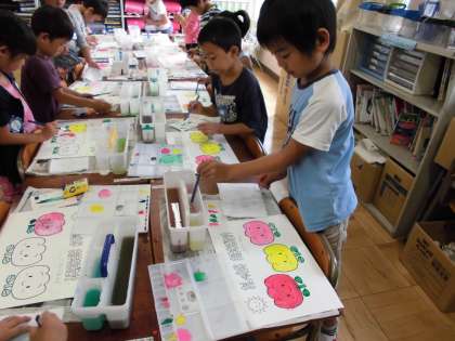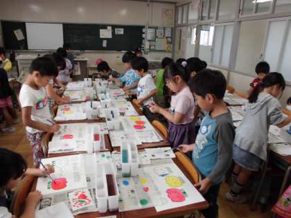 今日は、初めての絵の具練習をしました。パレットや筆洗の使い方、水加減などに気をつけて、チューリップの花を塗りました。初めは、とても緊張していた子どもたち。3つ目の花を塗るときには、楽しんで活動できました。教室は、カラフルなお花畑のように明るくなりました。次回は、混色の練習をする予定です。
