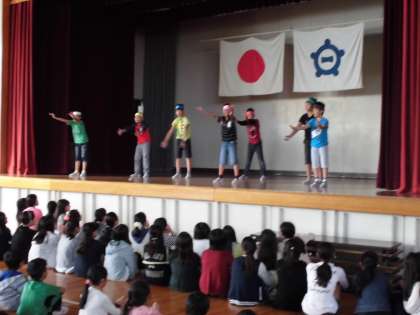 今日の集会では、今週の土日に行われるサッカー部とミニバスケット部の激励会が行われました。応援団の人たちが息のそろったパフォーマンスを披露してくれました。学校全体の声援を受けて、大会では1勝をめざして頑張ってください。