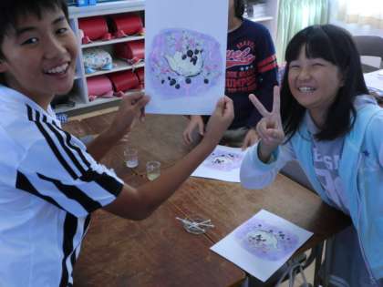 理科の実験で楽しく性質調べをしました【10月13日(木)の6年生】 公開日 2016/10/13 更新日 2016/10/13 6年 今日は、紫キャベツの性質を生かして色塗りをしました。色を使い分けて、丁寧に塗ることができました。