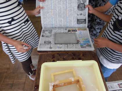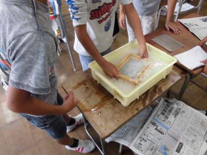 絵手紙を描こう その2 【10月14日(金)の3年生】 公開日 2016/10/14 更新日 2016/10/14 3年 絵手紙を描くための、紙作りを行いました。紙をすいて、乾かしてという作業を友だちと協力して進めました。自分で作った紙を使って、絵手紙を描いていくのは、とても楽しみですね。