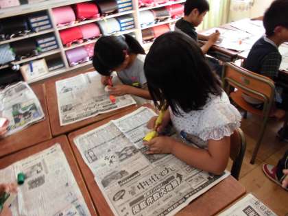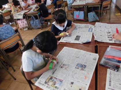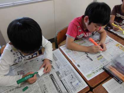 今日は、共同制作の作品づくりをしました。トイレットペーパーのしんに好きな模様をかきました。どんな作品になるのかな。お楽しみに♪