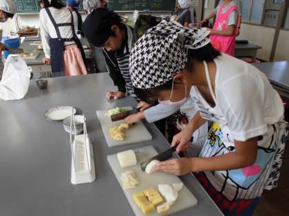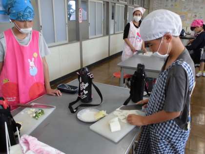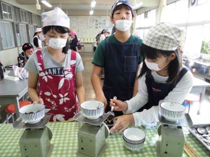 調理実習その2【10月19日(水)の5年生】 公開日 2016/10/19 更新日 2016/10/19 5年 大根、ネギ、油揚げを包丁の使い方に気をつけて切りました。みそも量りを使って、人数分用意しました。