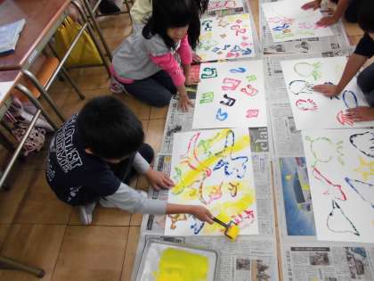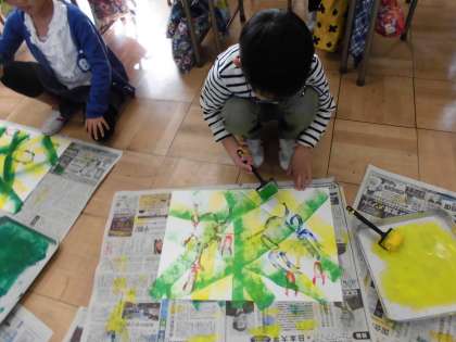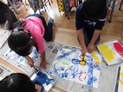 今日は、ローラーを使って製版をしました。色鮮やかな作品になりましたね。