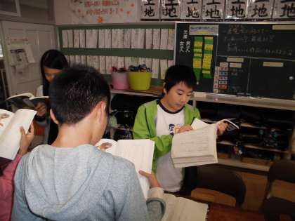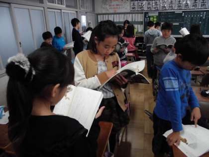 大造じいさんとガン【10月25日(火)の5年生】 公開日 2016/10/25 更新日 2016/10/25 5年 大造じいさんとガンの授業風景です。授業の初めにペアで音読をします。何度も読むうちにスラスラと読めるようになりました。