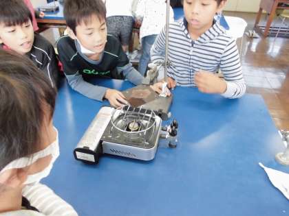 理科の実験で、金属の温まり方を調べました。ガスコンロと蝋(ろう)を使い、安全に気をつけて調べることができました。