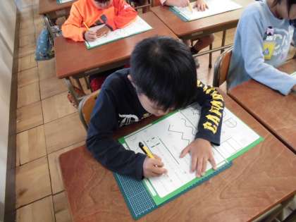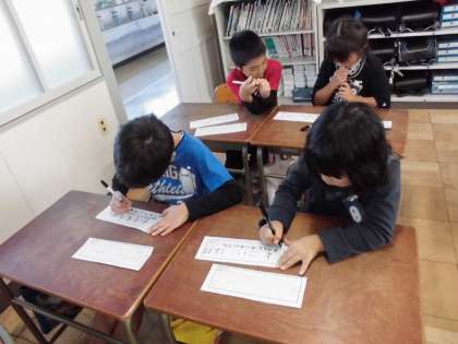 作品づくり その1 10月27日(木)の2年生 公開日 2016/10/27 更新日 2016/10/27 2年 今日は、展覧会の作品の名札作りをしました。下書きを見ながら、丁寧に清書することができました。