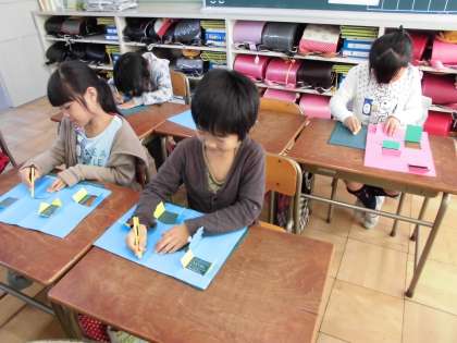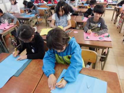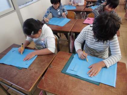 今日は、カッターナイフを使って、お気に入りの窓をつくりました。下書きの腺からはみ出さないように慎重に切る姿から、「素敵な作品を作るぞ!」という気合いが伝わります。夢のまちづくりを目指して頑張ろうね。