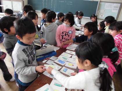 いらっしゃいませ!! 【1月27日(金)1年生】 公開日 2017/01/27 更新日 2017/01/27 1年 今日の国語の時間、おみせやさんごっこをしました。商品をカードにかいて、品物の準備をしました。お店屋さん役とお客さん役に分かれて、それぞれの立場を経験しました。自分のお店の品物が売り切れると、大喜びでした。