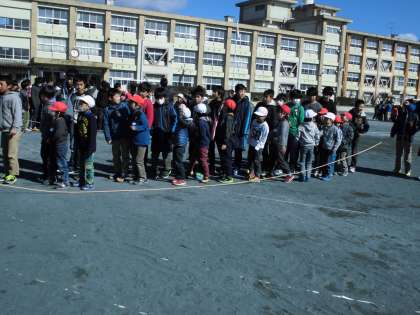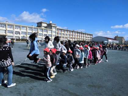 なわとびチャレンジカップ 【2月2日(木)1年生】 公開日 2017/02/02 更新日 2017/02/02 1年 今日は、全校なわとび大会がありました。1年生の個人戦は、後ろ跳び30秒チャレンジでした。日ごろの練習の成果を試すことができました。どの子も精一杯、頑張っていました。8の字跳びや6年生とのペア跳びも、思いっきり楽しんでいました。よい思い出になったと思います。