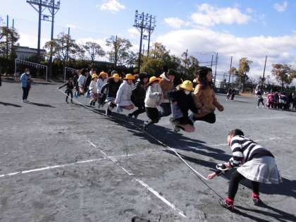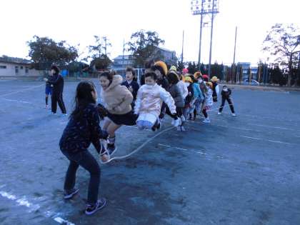 なわとび大会 その3 【2月2日(木)】 公開日 2017/02/02 更新日 2017/02/02 学校生活 ペア学年でのみんなでジャンプの様子です。うまく飛べたペアもありますが、回数は1回で終わってしまいました。なかなか跳べないので、1度跳べると安心して2回目のジャンプを忘れてしまうようです。先生も一生懸命に縄を回してくれて、楽しく行うことができました。