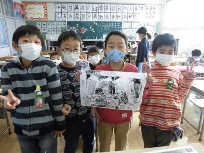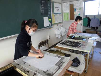 紙はんがを作ったよ(2月3日の3年生) 公開日 2017/02/03 更新日 2017/02/03 3年 様々な材質の紙や毛糸を使って、物語の一場面を版画にしました。 刷り上がった作品を見て、お互いの良いところを伝え合う場面も見られました。