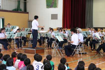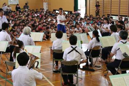 指揮者の体験コーナーがあり、児童が指揮をさせてもらいました。