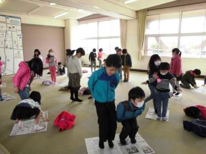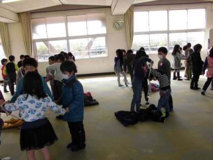 今日、学年合同で「みんなで力を合わせて」の学習をしました。1つ目は、じゃんけん大会をしました。じゃんけんで負けたら、新聞紙の大きさが、どんどん小さくなっていきます。最後まで残れるように力を合わせていました。2つ目は、輪くぐりをしました。みんなで力を合わせないと輪をグループの子の体を通すことができません。みんなで力を合わせることの大切さをたくさん学習できたと思いました。