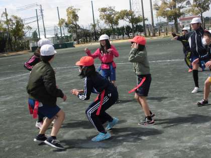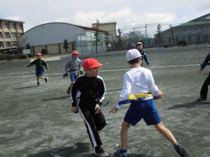 タグラグビー!ガンガン動こう!【3月15日(水)の4年生】 公開日 2017/03/15 更新日 2017/03/15 4年 体育の授業ではタグラグビーを行いました。相手の陣地に攻めるためにいろいろな工夫や作戦を立て試合を行いました!