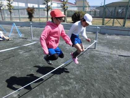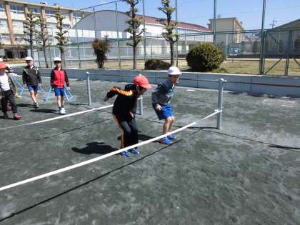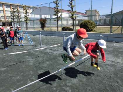 そろえてジャンプ【3月17日(金)の2年生】 公開日 2017/03/17 更新日 2017/03/17 2年 今日は、ゴム跳びをしました。始めは、「跳べるかな」と心配そうにしていた子も、勢いをつけて思いっきり跳ぶことができました。また、友達と呼吸を合わせて両足で跳んだり、ゴム跳びを使った遊びをしたりして楽しく体を動かせました。