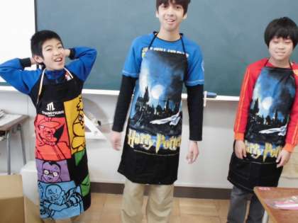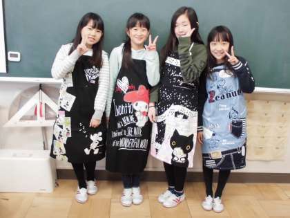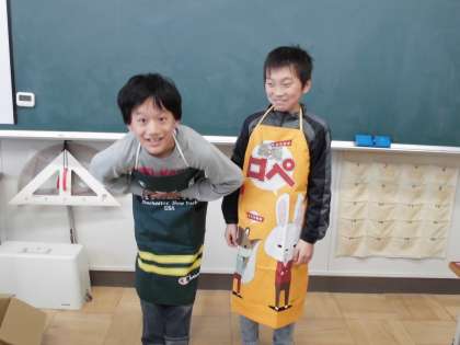 家庭科で作ったエプロンをつけて、友達のいいとこ探しをしました。ポケットの形や大きさ、使いやすい位置についているなど、たくさん見つけることができました。