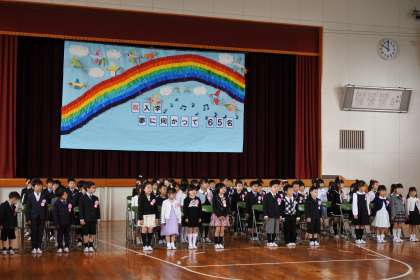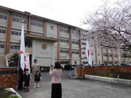 (中)(下)満開の桜の下で、平成29年度の入学式が行われました。みんなしっかり話を聞くことができましたね。