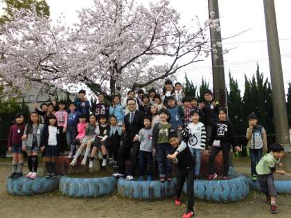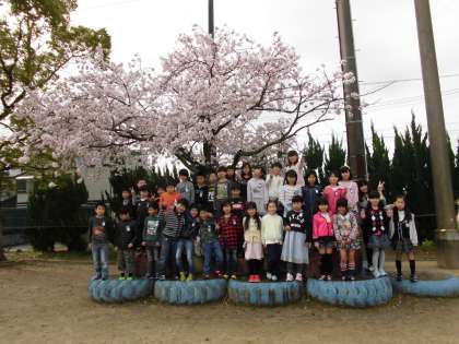 きれいな桜が咲いていたので、桜を背景に学級写真を撮りました。