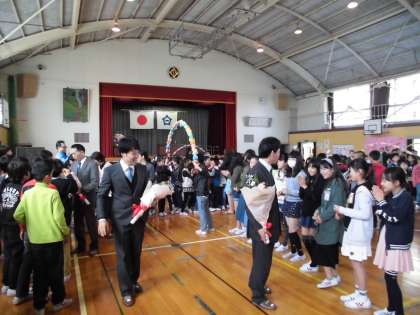 先週の浅井中小学校 その1 【4月16日(日)】 公開日 2017/04/16 更新日 2017/04/16 学校生活 (上)退任式がありました。懐かしい先生方とのお別れの会でした。学校全体で感謝の気持ちを伝えることできました。 (中)1年生を迎える会では、ペア学年で楽しむ時間もありました。 (下)授業も本格的に始まってきました。手の挙げ方や返事の仕方などを最初にしっかり教えてもらいました。