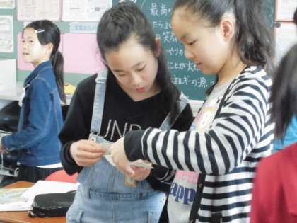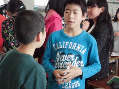 名刺交換をしました。「4月19日(水)の6年生】 公開日 2017/04/20 更新日 2017/04/20 6年 先週の英語の時間に名刺を作りました。それを使って、友達4人と英語であいさつをして名刺の交換をしました。