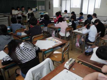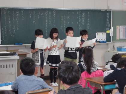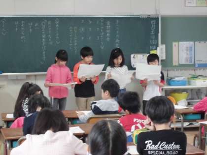発表を聞く子は、ただ聞くだけでなく、グループの発表のどんなところがよかったかを考えてメモしながら聞きました。みんな真剣に友達の発表を聞くことができました。