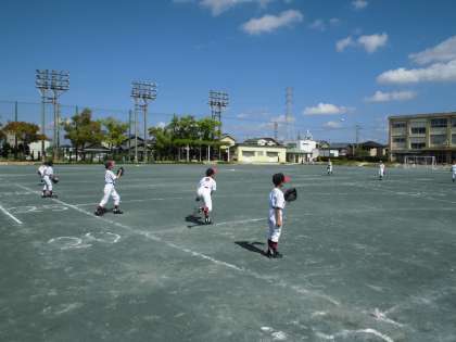 連休中ですが、グラウンドでは少年野球の練習が行われていました。コーチのみなさんに熱心に教えてもらいながら技術の向上に努めていました。