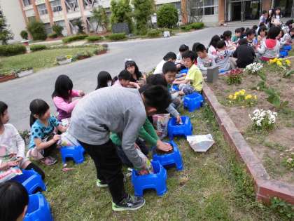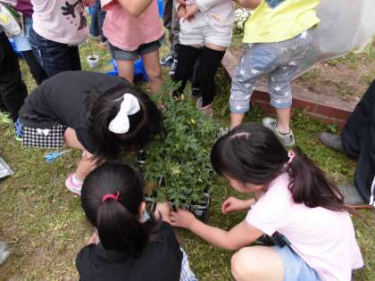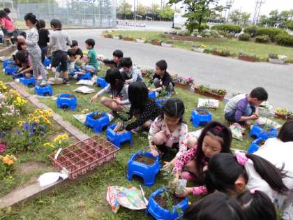 生活科の時間にミニトマトの苗を植えました。これから水やりなどの世話をしっかりして、おいしいミニトマトを育てていきます。