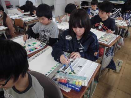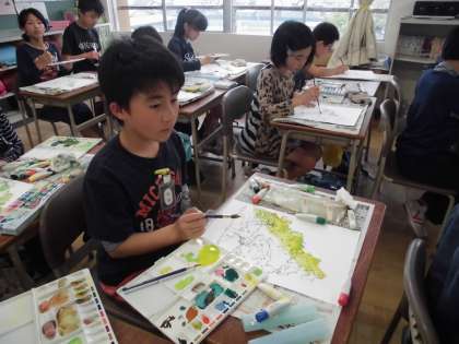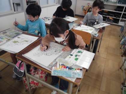 作った絵の具の色を使って、木の色塗りをしました。