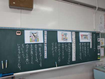 道徳の授業で「雨のバス停留所で」という資料を通して、相手の立場を考えて決まりを守ることの大切さについて考えることができました。