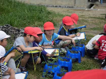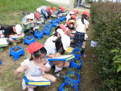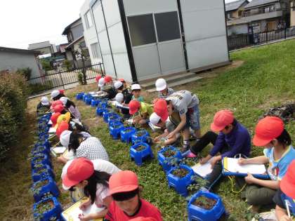 苗の観察をしたよ【5月11日(木)の2年生】 公開日 2017/05/11 更新日 2017/05/11 2年 今日は、火曜日に植えたミニトマトの観察をしました。ここ見てポイントに気をつけて、一生懸命観察しました。「手のひら2つ分のたけだったよ。」「葉っぱはざらざらだたよ。」とみんな興味津々でした。