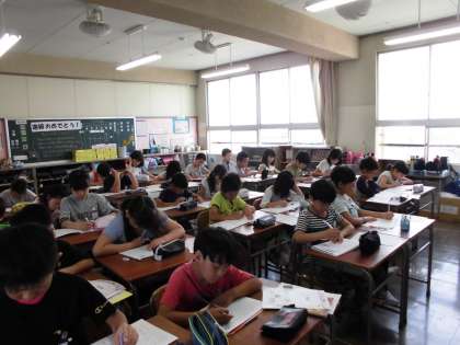 (中)確認タイムでは、全学年が静かにプリント学習を行い基礎学力の定着に努めています。