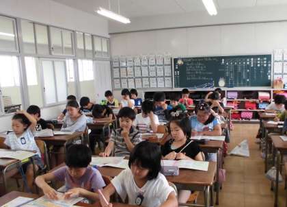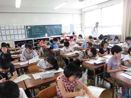 国語では、ローマ字の学習に入りました。今日は、aiueo(AIUEO)をあいうえお、と読んだり、書いたりする練習をしました。ローマ字で書いてあるいろいろな文字や文章が読めるようになるのが楽しみです。