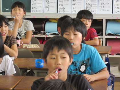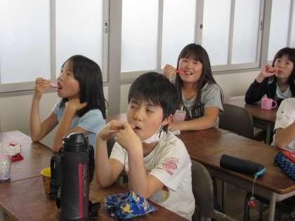 給食後には歯磨きをしています。 今日からは、歯磨き後にはフッ素を使ってさらに歯をきれいにしました。