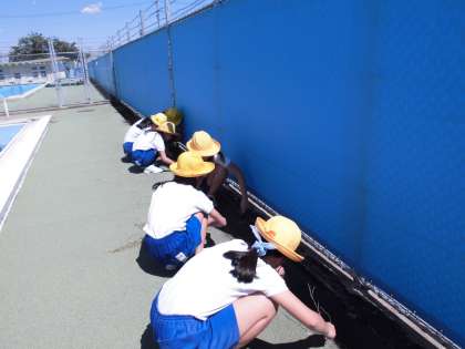 4年生のヤゴ救出作戦のあと、プール清掃となります。プールの中については、業者の方にきれいにしていただけるとので、今日は6年生がプール周りの清掃を行ってくれました。昨年の秋から使用していないため、落ち葉や砂がかなり溜まっていました。落ち葉を集め、草をむしり、トイレや更衣室もしっかり清掃してくれました。みんなで協力して行ってくれたおかげでとてもきれいになりました。これから暑くなってくると、子どもたちが楽しみにしているプールの授業も始まります。6年生がきれいにしてくれたプールをみんなで大切に使っていきましょう。