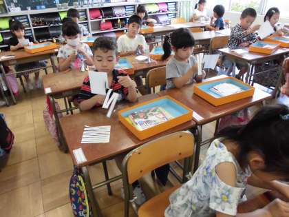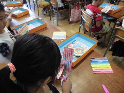 ハサミを使って、紙をきれいに切りました。切り方が違うと、できる形も違ってきました。