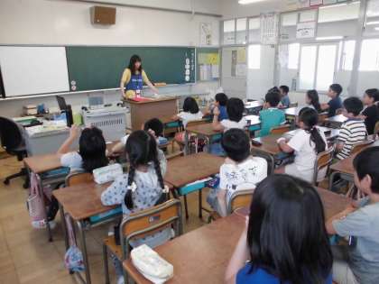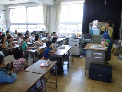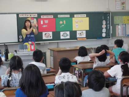 本日は給食センターから食育指導の先生が来てくれました。食事のバランスを考えることを学び、食事について興味を持つことができました。