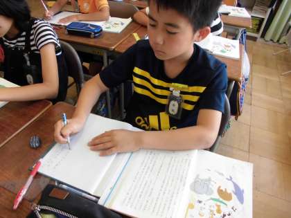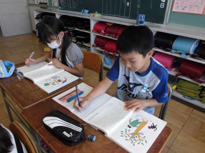 国語の時間です。今、読んでいる説明文の要旨をまとめました。みんな真剣に取り組めました。