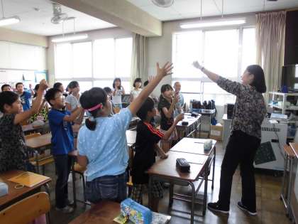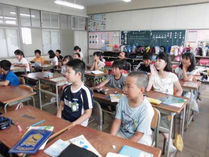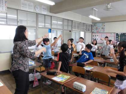 楽しく英語を学びました【6月20日(火)の4年生】 公開日 2017/06/20 更新日 2017/06/20 4年 毎回英語の時間は、ハローソングの中で仲間や先生とじゃんけんをして始めます。楽しい雰囲気の中でスタートしています。今日の英語の時間は好きなものを英語で言う表現を学習しました。果物や動物など、自分の好きなものを言えるようになりました。