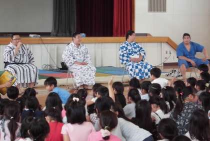 はっけよーい【6月26日(月)の6年生】 公開日 2017/06/27 更新日 2017/06/27 6年 荒汐部屋の力士のみなさんが見えました。6年生も代表で相撲をとらせてもらいました。やっぱり強いかったです。