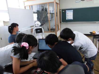 Pepperプログラムの授業も2時間目に入りました。職員が気をもむ以上に、子どもたちはパソコン操作でPepperを上手に動かすことができています。今日は、Pepperの言う言葉を自分たちで考えて、パソコンに打ち込む作業、実際にその通りに話すのかの確認を役割を分担して行いました。自分の名前を打ち込むだけではなく、「イケメンですね」「校長先生大好き」など、Pepperの前に立つ人を考えて言葉を打ち込んでいる人もいました。これからは、さらに複数の動作などを組み込むプログラムにも挑戦できそうです。子どもたちがどんなプログラムを作るのかが、とても楽しみになってきました。