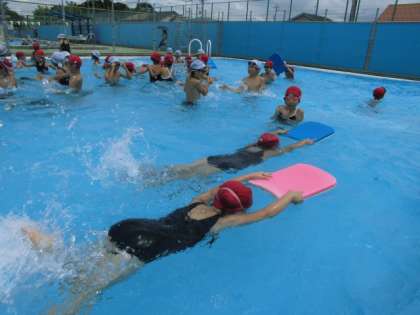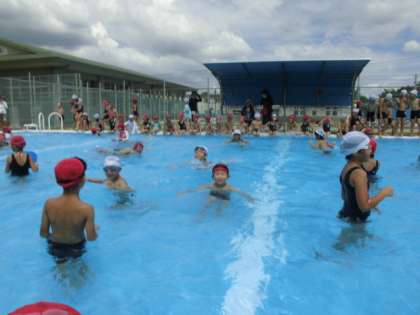 プール開放!大盛況!!(7月21日(金)) 公開日 2017/07/21 更新日 2017/07/21 学校生活 夏休み中の7月の平日13:30〜15:30には、学校のプールを開放しています。第1日目の本日は、たくさんの子どもたちでプールはいっぱいです。友だちと水をかけ合って遊んだり、泳ぐ練習をしたりして、楽しく過ごしていました。 プール開放に来る時には、交通安全に気をつけ、おうちの人や近くの子と誘い合ったりして来るようにしてください。ご協力よろしくお願いします。