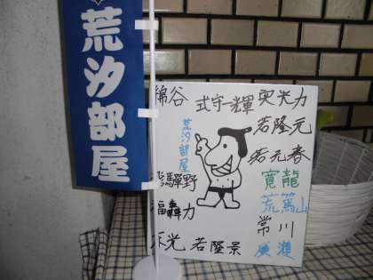 先日、学校へ来てくださった荒汐部屋の方から色紙を頂きました。荒汐部屋の一人ひとりの名前とおすもうさんの絵がかいてある色紙です。職員玄関に飾ってあります。