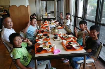朝ご飯の時間です。この後、天気がいいので海岸まで砂遊びに行きます。