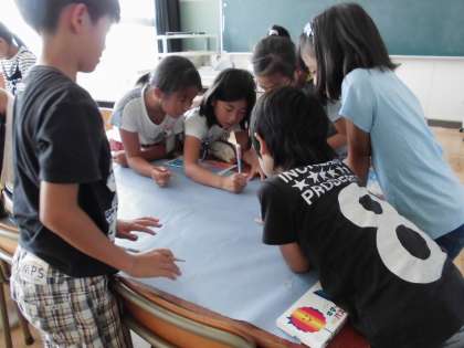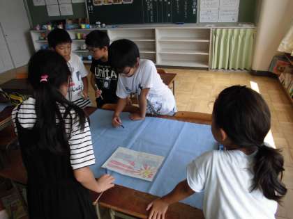 ソーラン節の旗作り【9月14日(木)の3年生】 公開日 2017/09/14 更新日 2017/09/14 3年 運動会でソーラン節を踊る際、クラスオリジナルの旗を披露します。考えたデザインを基に、協力して旗作りを頑張っています。どんな旗が完成するかお楽しみに!